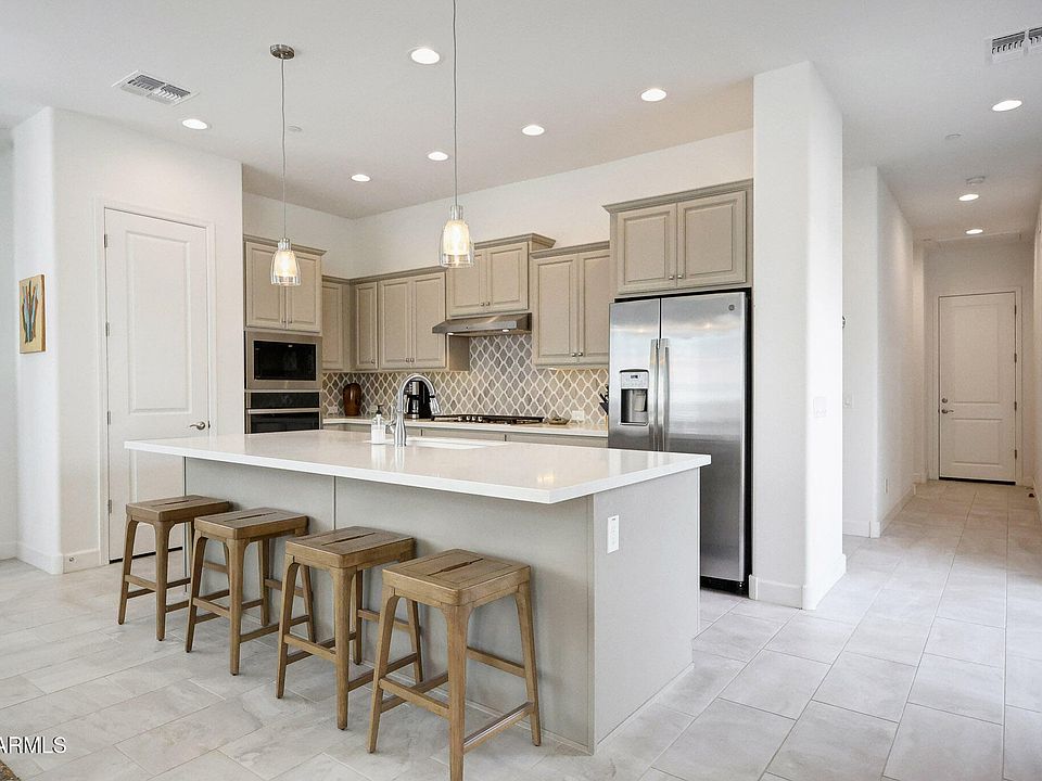 Charming David Weekley home on an elevated lot with TWO patios! Front patio features a custom gate & fencing (great for pets), while the private side patio is ideal for outdoor dining & grilling. Open floor plan w/10' ceilings includes a sun-filled dining area, great room and stylish kitchen with quartz island. Spacious owner's retreat offers tiled walk-in shower & generous closet. Den with doors doubles as guest space. TWO full baths. Lightly lived in by seasonal owners; washer/dryer/refrigerator convey, with furnishings available. Located in Mountainside—the ONLY gated enclave in Victory—residents enjoy exclusive pool, park & social spaces, plus access to all Victory & Verrado amenities. Truly great Arizona living!
