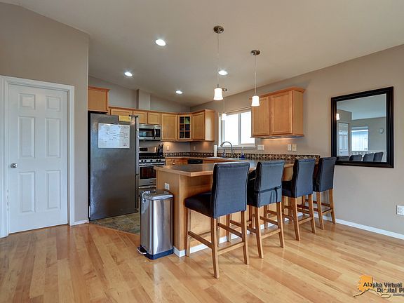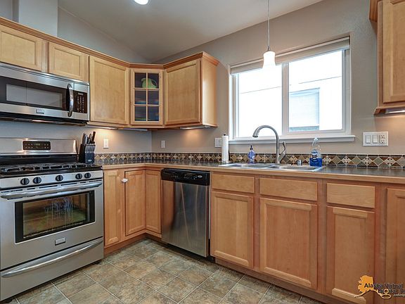 Welcome to Eagle Crossing with views in Eagle River! This stunning hillside ranch with basement home boasts breathtaking mountain views from every angle. With 3 bedrooms, 2.5 bathrooms, and a walk-out basement, this bright and open layout features vaulted ceilings and pre-wired surround sound for the ultimate entertainment experience. Enjoy the convenience of a fenced yard, balconies on each level, radiant floor heat, and an on-demand water heater for added comfort and efficiency. Don't miss out on the opportunity to call this beautiful property your new home!