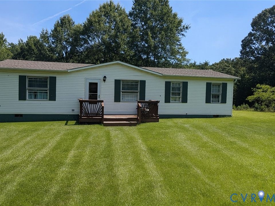 Enjoy peaceful country living on three private acres, just 15 minutes from Lake Anna. This four-bedroom manufactured home is set on a permanent foundation and offers a spacious living room with cathedral ceilings, and a large back deck overlooking the backyard, perfect for gatherings. While the home offers great space and potential, it could use a little TLC to make it truly shine. The primary bedroom features a full ensuite bath for added privacy, and three additional bedrooms share a second full bath. The roof was replaced in 2022. A metal garage with electricity and an attached carport also convey.