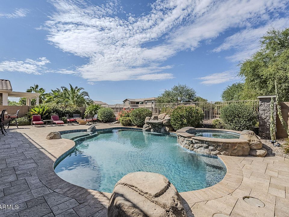 Inside to find a well-designed floor plan featuring a flexible loft and a valuable downstairs bedroom and full bathroom, ideal for guests or multi-generational living. The true highlight is the incredible outdoor living space! Enjoy the Arizona sunshine with a sparkling pool and relax under the expansive large covered patio which includes a convenient built-in kitchen, perfect for BBQs and gatherings. The gorgeous backyard is set up for making memories with friends and family. For peace of mind, the patio is secured by security shutters that cover the entire patio.