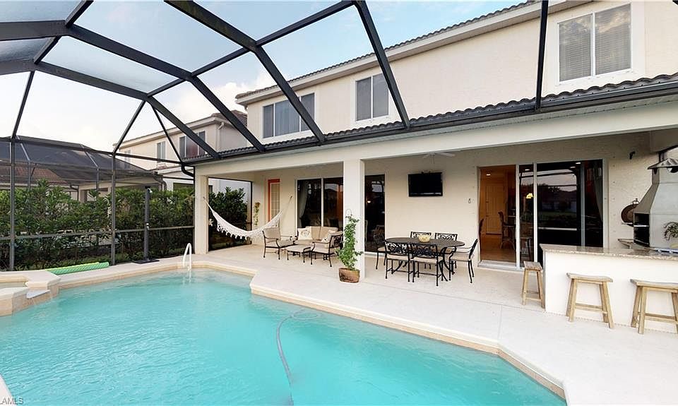 CLICK on 3D-TOUR LINK. Large 4 Bds 3 Bths, Pulte home, Screened Lanai, Salt Water Pool and Spa with unobstructed lake and landscape views; Lemon, Banana, Pineapples, Mango, Brazilian Grape, Suriname Cherry, Raspberry plants, are part of the private landscape; light filled open floor plan with large living room, adjacent dining area and spacious kitchen with island and upgraded stainless steel appliances; unique to this home is a double sided stairway leading to three bedrooms and a large Master Suite whose Bath and Walk in closet have a desirable window. Orange Blossom Ranch is a vibrant community that fulfills growing family needs with schools only 5 minutes away, but it's also a perfect retreat for the more laid back audience who will appreciate the public Valencia Golf Course nearby, an expanding choice of supermarkets, restaurants and shops, as well as the great Orange Blossom modern Clubhouse with two large pools and spa, tennis, gym, bocce and volleyball courts, bike and jogging paths. VERY LOW HOA fees when compared to other Naples gated communities with similar amenities. Don't think twice, this property is not going to last at this price.