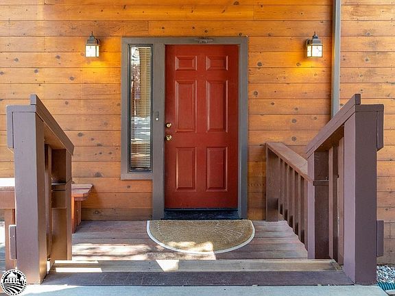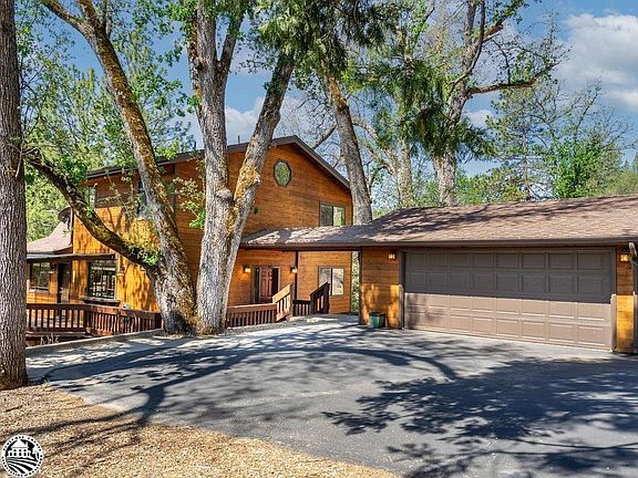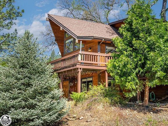 Spacious Rustic Design Cedar Cabin home with a long tree lined driveway, above Big Creek hiking trail just 35 miles from Yosemite National Park in Groveland, at Pine Mountain Lake. Solid construction 2386 sf, 3 levels, 3 bedrooms, 3 bath, custom design home that is in a private and tranquil setting. Cabin style tall peak windows with picturesque views. A spacious kitchen with tile counters, dining area and featuring large windows letting in tons of sunshine, and bedrooms on each level. The main level has 1 bedroom, 1 bath, kitchen and vaulted ceiling living room. Upper level is the master bedroom in open loft style with full bath that has a jetted tub, separate shower, and dual vanity. The spacious lower level has a gas fireplace, tile flooring, full bath, laundry and sleeping area. Detached 2 car garage, gated wood wrap around decking overlooking natural settings.