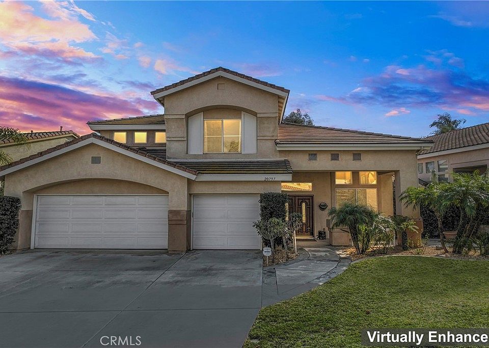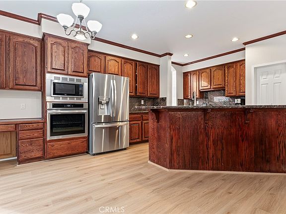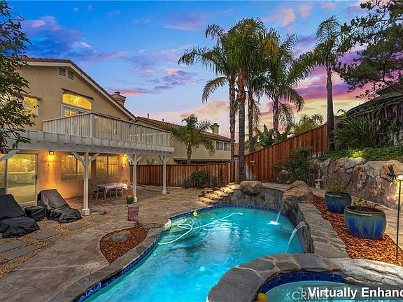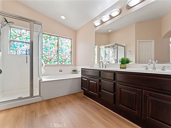 Stunning 4 bed, 3 bathroom home with two primary bedroom suites plus an additional bedroom and full bath downstairs. Quiet family-friendly neighborhood of Orangecrest. Kitchen is remodeled with dark cabinets, stainless appliances and granite countertops with peninsula for bar seating. Brand new waterproof luxury vinyl plank flooring throughout living areas. Double-door entry leads to Living/dining area with vaulted ceiling and natural light. Private pool and spa in the back with custom rockwork and multiple spillways. A covered patio and a deck leads off of the master bedroom. Lusciously landscaped oasis in back and green lawn with three car garage. Patio area on the side with shade triangles. Crown molding in the kitchen and living room. Beautiful stained glass window in the master. Master has double sinks, separate tub and shower, and walk-in closet. Second primary bedroom also has a full bathroom with double sinks, private tub and shower, and a walk-in closet. Third bedroom upstairs for extra guest or office space. Lots of shopping and dining options a short drive away. No HOA and low taxes.