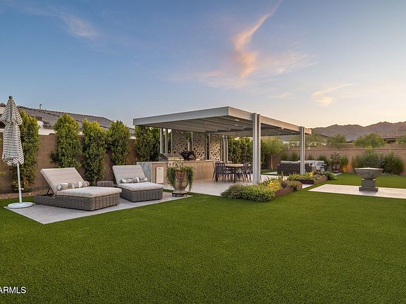 This 3/3.5 property is located in Victory's 55+ community in sunny Buckeye and is tucked into the stunning White Tank Mountains. Victory offers its homeowners a plethora of exclusive amenities with the active adult community lifestyle. From the instant curb appeal to stepping inside you are welcomed with an easy to navigate floor plan, a light and bright color pallet, high ceilings, custom curtains/shades and natural sunshine. Great room with walnut wood paneling opens up into the gourmet kitchen boasting floor to ceiling cabinetry, stainless appliances, quartz countertops, pendant lighting, storage in the walk-through butlers pantry with custom wall tiles and brass/glass shelving . Bedrooms are en suite with master bathroom and closet area custom build outs along with LED flush mount lighting and impeccable designer touches throughout. Additional study is detailed with wallpaper, brass accents and credenza. The backyard is where you will want to entertain year round. Outside you will find an extended length covered patio with floor tiles and LED lighting. Premium artificial grass, water fountain area with exposed natural aggregate. Modern pergola with adjustable louvers, decorative sidings, ceiling fan, floor tiles, marble tile BBQ island containing a 5 burner gas grill cook top. Along with a gas fire pit that measures 72' with exposed natural aggregate. 3 car garage with coated floors and LED lighting. Owner has made several upgrades, please see document tab for full list.