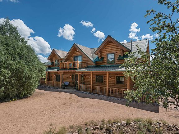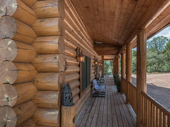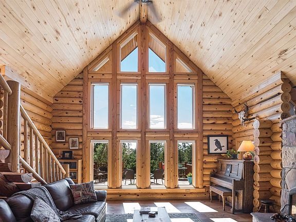 Super cool pitched roof luxury log home sited on 11 pristine acres with a private well and solar array to cover your electric and then some! Located an easy 15 minutes from town, this 2,000 sq. ft., 2 or 3 bedroom home has really incredible details; including hand-adzed doors, oak floors, built-in cabinetry and bookshelves and Vermont castings gas heaters. The living room enjoys cathedral ceiling and a two-story custom stonework fireplace/stove/heater capable of heating entire home while baking your pizza in the pizza over! Nice open feel to south facing main living areas with lots of light and opening to fabulous decks and patios surrounding the house to enjoy the quiet serenity. Master on the main floor with en suite bath and other bedrooms and sitting area upstairs. There is also a workshop with electricity, another storage building and carport. Truly a special and well loved retreat!