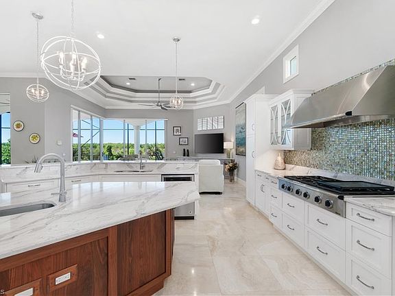H12669 Magnificent Audubon Estate Home with stunning lake, preserve, and sunset views. This Beautiful home is located on a 0.6-acre estate lot offered in Audubon Golf & Country Club. This North Naples' property was beautifully renovated with a Western exposure for prime sun on the spacious pool deck. Relax & unwind in the extremely private & fully screened-in pool/spa with ample living space & an outdoor kitchen – perfect for entertaining. This coastal contemporary home is finely appointed with marble & tile floors, an open floor plan & fully pocketing sliders. Gorgeous chef’s kitchen was recently renovated & features custom cabinetry, professional grade appliances & a gas range. Delight in 4 bedrooms/den with a large master suite, newly renovated master bath & guest suite on the first floor! The 2nd floor features 2 guest rooms & a spacious terrace overlooking the beautiful water views. Lushly landscaped for ultimate privacy. Audubon is perfectly located 5-minutes from Mercato & world-class beaches, with gated/guarded entry, 18-hole championship Golf Course, tennis, pickleball, Bayside boardwalk, newly renovated clubhouse with dining & spectacular poolside club & café.