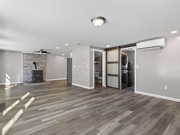 Completely renovated in 2020, the home features luxury vinyl plank flooring throughout, an updated kitchen with granite countertops and stainless steel appliances, and a beautifully finished tile shower. A functional utility room with a custom barn door adds both style and convenience. The open, efficient layout is ideal for comfortable everyday living.