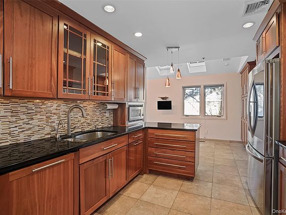 Greenwich end unit in Boulder Ridge Unit will be freshly painted in sought-after luxury townhome community in the Ardsley School District. Lovingly maintained and thoughtfully updated, this expansive home offers exceptional flexibility, easily living as four or five bedrooms with a highly desirable floor plan. The main level features an open layout anchored by a renovated eat-in kitchen with stainless steel appliances and direct access to the two-car garage with Tesla charger. The dining room opens through sliding doors to an oversized Trex deck, the perfect spot to enjoy spectacular sunset views. A sunken living room with a wood-burning fireplace creates a warm and inviting space for relaxing evenings, while a convenient powder room completes the level. Upstairs, the primary suite boasts an updated walk-in closet and renovated bathroom. Two additional bedrooms share a beautifully renovated hall bath with double vanities. The third floor is a great space as a home office but can easily serve as an additional bedroom or flex space. The lower level features a second wood-burning fireplace and two sliding glass doors that open directly to the backyard. An additional room offers flexible use as a guest bedroom, home office, or extra storage, along with utilities and laundry. Community amenities include a pool, tennis and pickleball courts, a clubhouse with private event space and fitness center, a playground with a newly renovated basketball court, and 24-hour gated security. Bus service is available to all three Ardsley schools, with easy parking at the Hartsdale Metro-North station. Luxury living meets everyday convenience. A must see! 2026-01-16