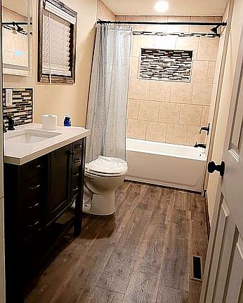 . Entire house and garage newly renovated. New roof,windows, doors, flooring, wiring, plumbling, kitchen, bathrooms. Walls ,trim etc. Large rear covered deck with under deck storage protected from weather and rain.