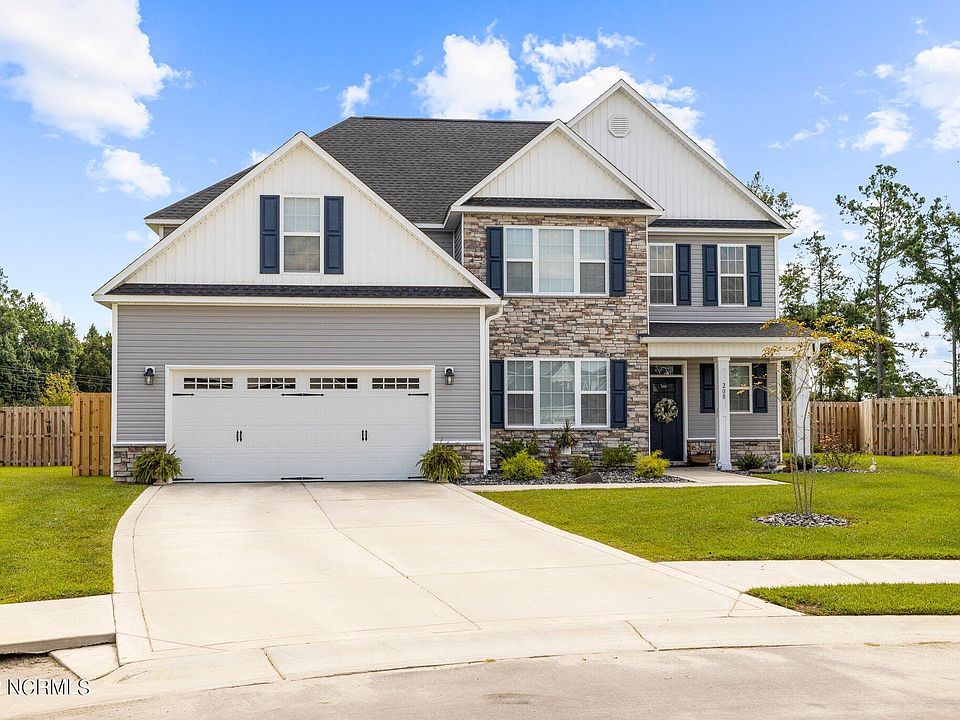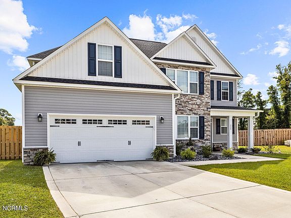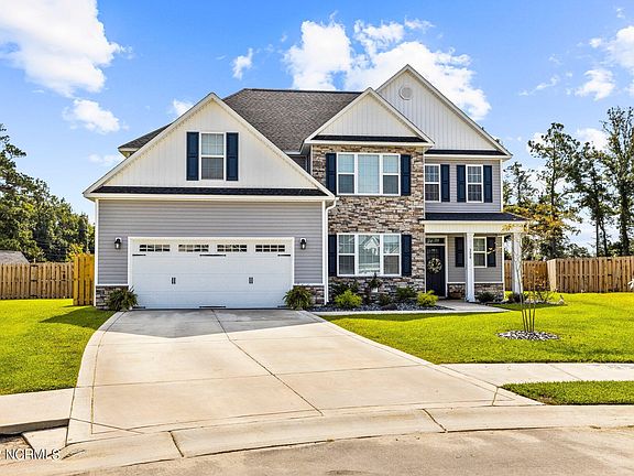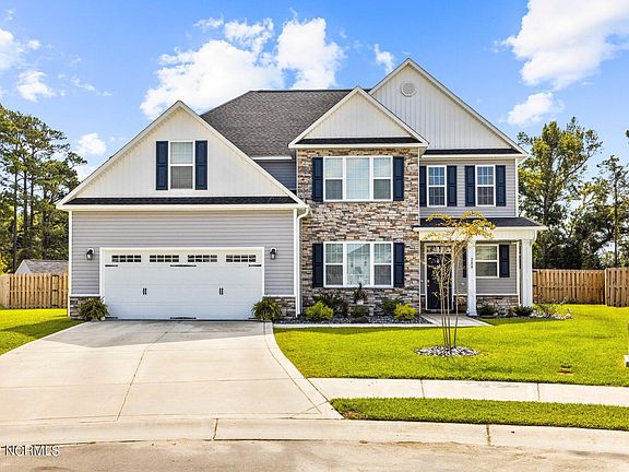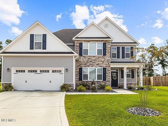 This Laura E Floorplan originally built by Sydes Construction has all of the bells and whistles, is only a year old and has only had 1 owner! This amazing masterpiece boasts 5 bedrooms and 4.5 bathrooms! The charming exterior features easy to maintain vinyl siding with board and batten and decorative stone accents, sodded front yard and custom stone front landscaping, 2 car garage with custom built shelves and a covered front porch. The foyer gives a grand impression and the open living area is perfect for entertaining as it opens to the expansive kitchen and includes a cozy fireplace! The eat-in kitchen is beautiful with lots of recessed lighting, granite countertops, large island, stainless steel appliances and the pantry includes custom pull-out drawers for added efficiency! The formal dining room has tons of character with its shadowbox wainscoting, chair rail and crown molding. There are master bedrooms on both the first floor and the second floor that both feature trey ceilings with crown molding accent and ceiling fans, walk in closets, and large master bathrooms complete with walk in glass-doored showers with built in seats. The upstairs master also includes a spacious sitting room of it's own! The backyard is fenced in with a staggered shadow box style privacy fence and comes with a covered patio, fire pit and custom shed with shelving and re-enforced flooring strong enough to hold a riding mower. The large lot is just short of an acre, and is situated at the end of a private cul-de-sac! This home is located in the heart of Swansboro within a short distance to the beautiful and world-renowned Hammocks Beach State Park, close to shopping, bases, dining and of course the beach! You cannot go wrong with this home in this ideal location. Proximity to schools and a peaceful community add to the area's charm!