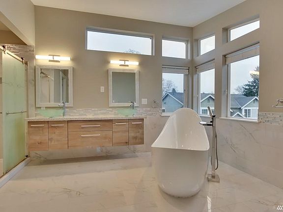 Gas fireplaceModern exteriorSoaring ceilingsLuxurious master suiteHardwood flooringSpa-like en suite bathSoaking tub
