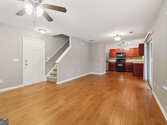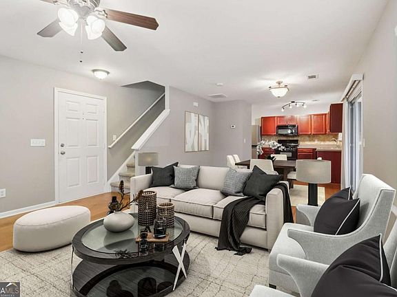 Move-in ready home filled with bright, open spaces! Enjoy a welcoming front porch perfect for relaxing. Inside, beautiful and easy-to-maintain laminate wood floors flow throughout the main level. The spacious open-concept living room offers abundant natural light and seamlessly connects to the dining area, which features easy access to the back patio-ideal for indoor-outdoor entertaining. The kitchen features a stylish tile backsplash and plenty of cabinet and counter space. A convenient half bath completes the main level. Upstairs, retreat to the primary suite featuring a private en-suite bath with a walk-in shower. Two generous secondary bedrooms and a full hall bath provide space for everyone. The laundry room is located upstairs-no more hauling baskets up and down the stairs! Outside, the fenced backyard includes a patio for grilling and plenty of green space to enjoy. This vibrant community is packed with resort-style amenities, including an Olympic-size pool, pickleball and tennis courts, basketball court, dog park, fire pit, fitness center, multiple playgrounds, and regular clubhouse events. With no yard maintenance and no rental restrictions, this property is the perfect turnkey primary residence or investment opportunity. Ideally located just minutes from Downtown Woodstock, I-575, The Outlet Shoppes, top-rated schools, parks, and recreation, this home offers the best of convenience, comfort, and community. Don't miss your chance to call this River Park gem your own-schedule your private tour today!