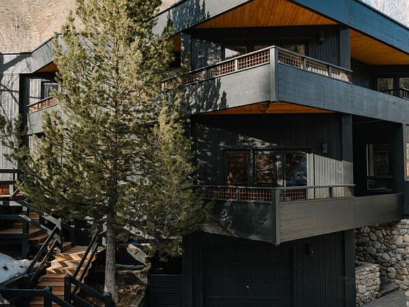 Architecturally distinctive retro 1970s ski chalet with stunning Baldy views, Warm Springs Creek to fall asleep to, or jump in & fish, and exceptional natural light. Fully reimagined with design-forward updates, custom solid oak interiors, two fireplaces, Sub-Zero/Wolf kitchen, and multiple balconies and deck. A rare blend of preserved vintage character and modern luxury. This iconic Warm Springs home has been carefully curated by a professional interior designer, honoring its original vintage spirit while delivering a thoughtful, high-end modernization. Natural materials define the interiorssolid oak paneling and custom millwork, marble, terrazzo, and granite throughout, with bespoke oak lighting.