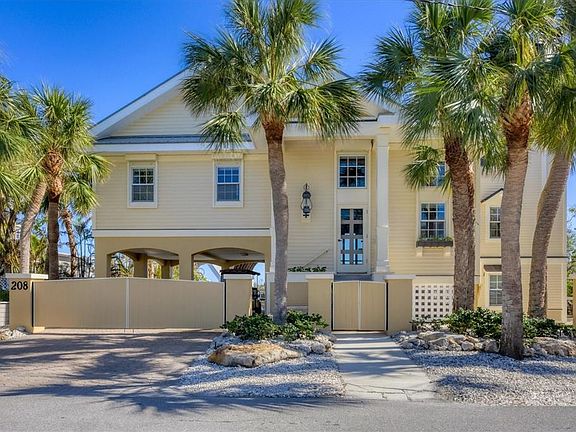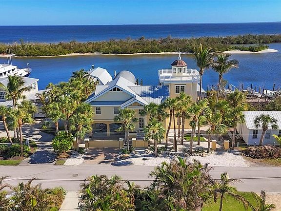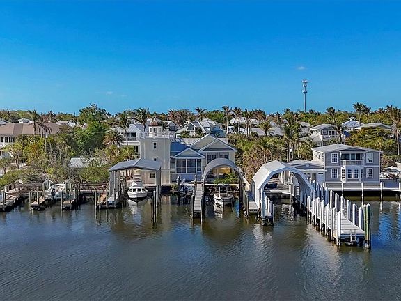 RARE OPPORTUNITY OF PURCHASING A CUSTOM WATERFRONT HOME WITH PRIVATE “MARINA” WHICH INCLUDES 3 DEEPWATER SLIPS, 2 OF WHICH ARE UP TO 100 FEET IN LENGTH, IN THE HEART OF BOCA GRANDE! Located with easy access to the ICW from the Millers Marina Channel this is a one of a kind property. Offering deepwater, long slip lengths and housing for the owner and/or the crew! Of the two covered slips, one is 60ft x 18 1/2ft and the other slip is 100ft x 18 1/2ft. Both boat covers are a work of art and engineered with concrete 45 ft long driven pilings, metal roof detailed with a yellow pine underside and galvanized aluminum. The center slip is 100ft x 20ft and is equipped with a lift. A tackle room is conveniently located adjacent to the dock for easy access. Designed by architect George Palermo and built by Pat Ball of Ball Construction originally on a 50 ft wide lot in 1994 then added on in 1999 when a 25ft adjacent lot was purchased for a combined 75ft of prime waterfront. The home consists of 4 bedrooms, 4.5 baths, a comfortable kitchen and living area, loft, large screened deck overlooking the water and boat docks plus a roof top deck. The house can be used as a primary or vacation home as well as staff for crew and team members. The main house has a kitchen and living area with sliders and a screened lanai overlooking the water and docks. The master bedroom has a queen bed and an en suite bathroom with a stall shower. There is also a guest bedroom with a queen-sized bed, both bedrooms have sliders to enjoy the view, with electric hurricane shutters for extra protection. A loft area overlooks the living area and water with a trundle bed but is also perfect for an office! The “Lighthouse” is accessed via a rear entrance to a bedroom with an en suite full bath, then up a set of stairs to a loft with built-in bunk beds and a full bath. There is a special rooftop deck with a custom copper topped light with access via pull down stairs. Call now for a private showing of this special piece of Boca Grande, Florida.