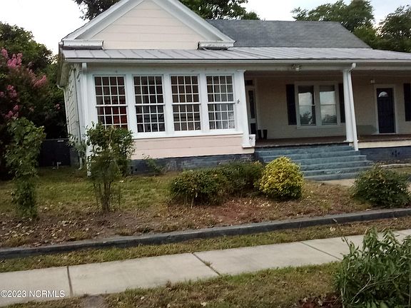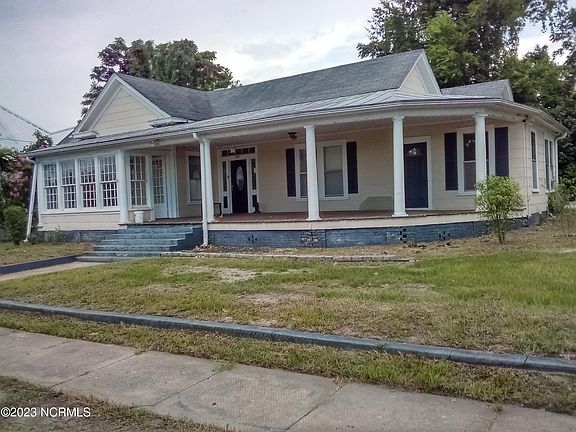 This one-story, fixer-upper home near downtown Hamlet could be yours! It features 3 large bedrooms, 2 bathrooms, high ceilings, fireplace, and hardwood floors throughout. The kitchen and bathrooms were updated. Kitchen boasts an island, beautiful light fixture, and lots of cabinet space. There is a sunroom on the side of the huge front porch; great for plants and sitting for relaxation. Driveway leads to a concrete patio on the side. With a little tlc, you could make this (sold as-is) your dream home. Close proximity to the Hamlet Library, train station, museum, and shops.