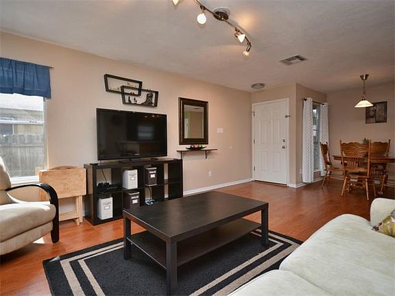Less than a block from the park this three (3) bedroom home has a new stainless steel french door fridge, vent hood, vent duct to outside, kitchen granite counter tops, gas water heater and new toilets. Upstairs has loft and laundry room. Deep shaded backyard with deck for enjoying Texas evenings. Community has a park and playground. Roof replaced 2012.