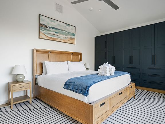 The highlight of the upper level is the lavish master suite, boasting a king size bed with storage, Smart TV, and a spa-like ensuite bathroom with a grand shower featuring dual shower heads and a double vanity. There is also an adorable balcony off of the master with a bistro table and chairs.