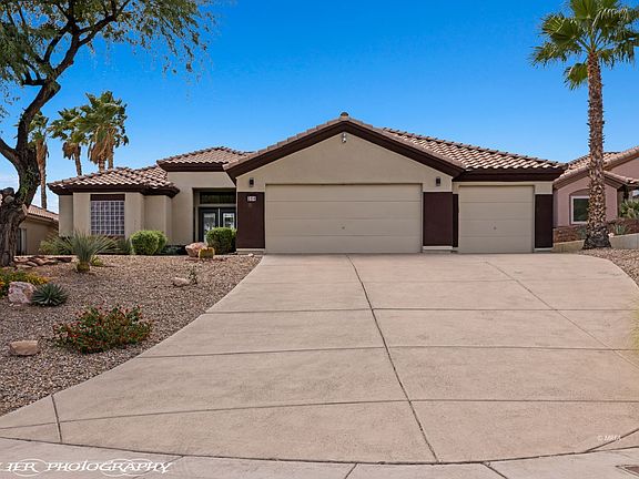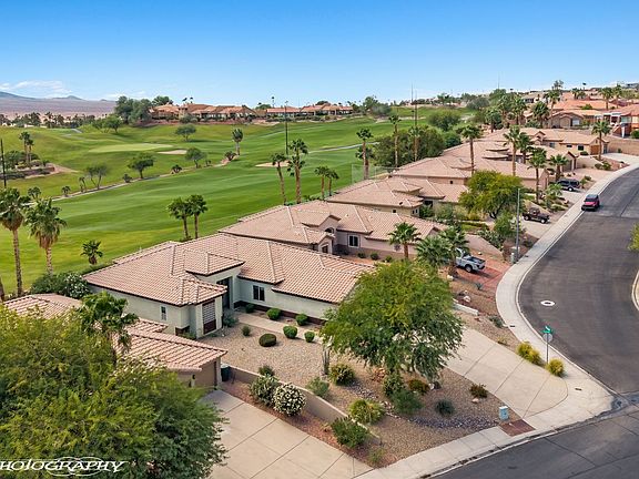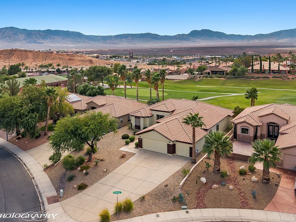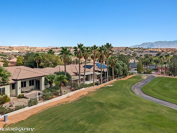 On # 1 Fairway of The Palmer - Views of Fairway & Mountains. "Highly sought after....Highly desirable location in Mesquite" Offering sweeping views of the Virgin Valley mountains across the # 1 fairway of The Palmer Golf Course. Unique "low hoa of $53 per month" provides access to Mesquite Vistas Sports Center, offering the ultimate in amenities...swimming pool, hot tub, workout facility, pickleball courts, basketball courts, outdoor sand volleyball court, horseshoe pits and on site food services and beverages. Beveled Glass French Doors accent the entry to this beautiful residence. Living room has 11' ceilings and large picture windows that showcase the natural beauty from this simply amazing location. Unique floor plan offers a fireplace that is centrally located between the dining area and the kitchen. Open living design has kitchen, dining area and living room all within view. New refrigerator, oven-range and microwave 2025. Main bedroom suite is impressively gracious in size. Main Bathroom has new tiled walk-in shower and tile surround soaking tub. Heat pumps replaced in 2018. Whole home replumbed in 2018. Replaced 8 back house windows and sliding doors with Anderson Windows. Three Car Garage.