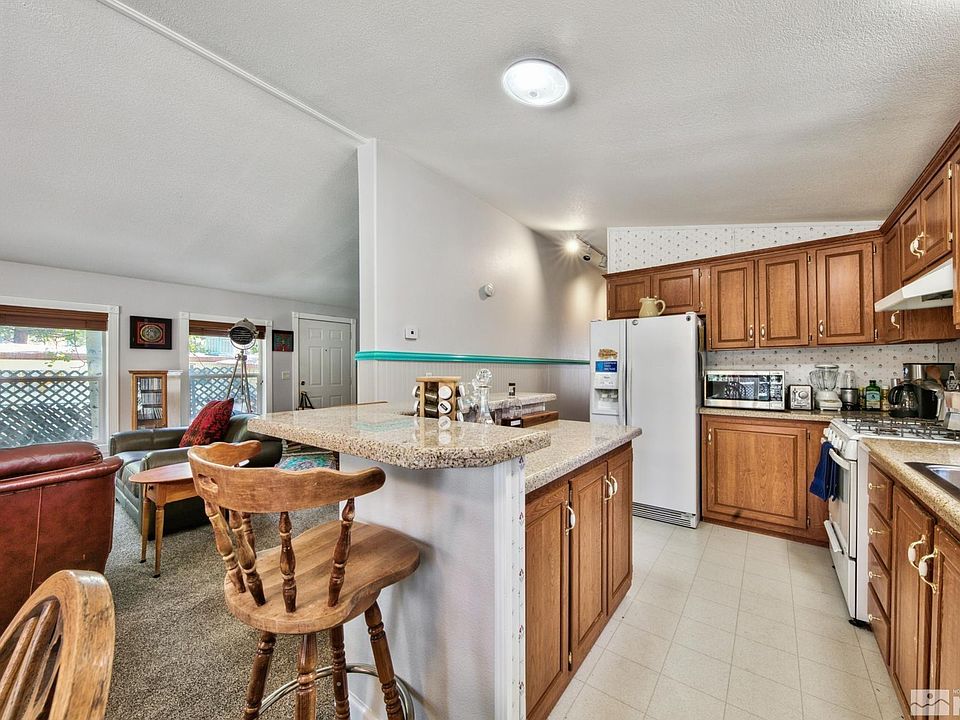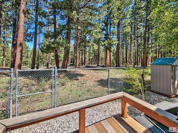 One of the nicest mobile homes in all of Ponderosa Park. Also one of the premier locations, backing to miles of USFS land, and the quiet, serene forest. This 2 bedroom, 2 bath unit, built in 2002, has vaulted ceilings throughout, a cozy gas log fireplace that heats the entire unit, granite kitchen counters w/ gas stove, master w/ double sinks, laundry room, newer composite front and back decks, heat tape system & gutters ($3500) on composition roof, & fenced yard. HOA of $125 per month includes water,, snow removal, common area maintenance, & extra parking. Sold mostly furnished. Ponderosa Park homeowners own the lot, no space rent. Located in super convenient Lower Kingsbury, walking distance to casino action, and miles of hiking and biking right out your back door. This unit has way more value than any $500,000 condo!