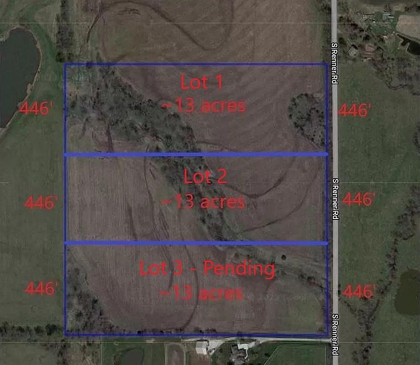 Seller is in the process of receiving county approval for the division of existing 40 acres. (3-13 acre lots.) The southern 13 acres is under contract. See map for Lot 1. This listing is for the northern 13 acres. There are nice rolling hills, woods, and a slope that drains off to the east. Waterway through middle of land; potential pond site. Beautiful views for sunsets and sits up for nice views all around. . Great location for home site, horses, etc... many great options.