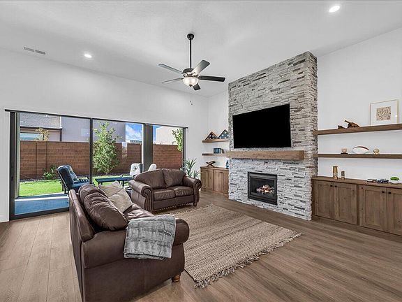 The kitchen features a butler's pantry, gas range, and plenty of storage. The living area includes custom built-in shelving and a gas fireplace, creating a warm, practical space to gather. The primary suite is bright and relaxing with modern finishes and thoughtful details. Recent upgrades include pull-up/pull-down blinds, added can lighting, a water softener, epoxy garage floors with built-in cabinets, and a side gate for extra parking or storage. Also added was backyard turf and xeriscaped front yard to make maintenance easy so you can enjoy more of what Southern Utah offers. Located near the PGA golf course, hiking, biking, lakes, trials, and Snow Canyon State Park, in a quiet but established neighborhood. This home balances freedom, simplicity, and modern desert living. Call today for more information or to schedule a showing.