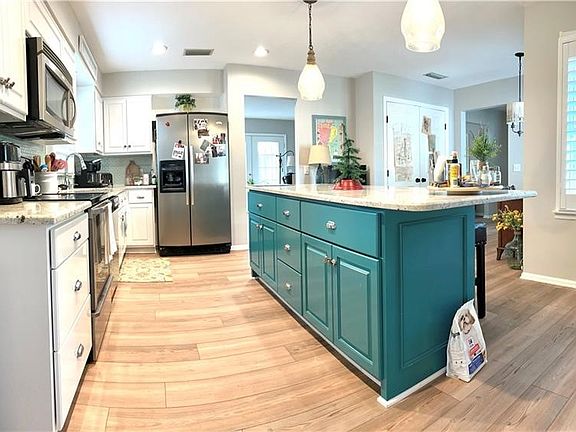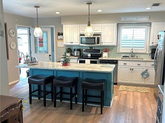 This adorable cottage has an updated kitchen, flooring, outdoor living area. Really easy to maintain. Convenient to walk to the village or for beach golf cart rides. Living room has a gas fireplace for cozy winter evenings. Enjoy a nice dinner on outside deck or get some sun, peace and quiet! Great place to curl up with a good book. Three bedrooms, two baths, all on one floor! Nice bay window in dining room, the breakfast bar in the kitchen is wide and long for great cooking, breakfast with the kids or crafts. One car garage has built in storage, home gets lots of great natural light and is easy to maintain. Roof is metal. Beautiful shade from a big oak on property, lot is landscaped and well maintained. Small storage shed in back yard area. This is a great neighborhood, on south end of St. Simons, lots of wonderful family style restaurants within an easy walk, bike ride or golf cart trip!