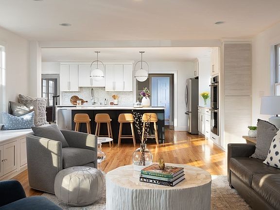 Welcome to Poplar House, an elegant brick manor set behind a circular driveway on a third of an acre in desirable Chestnut Hill. Versatile first floor layout includes a breathtaking 2022 open-plan kitchen outfitted with a quartz-capped island, hi-end appliances, and custom window seats; a formal dining room; a great room with cathedral ceilings, fireplace, a wet bar, and a dedicated entrance; an ensuite bedroom, office or au pair suite with its own bath and entry; plus pantry, laundry; and ½ bath. A second level offers three generous bedrooms and two lovely modern baths, including a palatial primary suite with a sumptuous walk-in closet; a lovely office or dressing room; and a study / den with deck. There is also a bonus lounge/family room. The third floor includes two spacious bedrooms and a stunning 2022 bath. C/AC. Electronic fence, two-car garage, and an expansive yard and patio with mature plantings and irrigation. Coveted location near shops, parks, library, and Baker School.