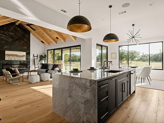 Private and secluded in the west corridor of Dripping Springs, live your modern Hill Country lifestyle and enjoy large acreage sites. Around 3 flat acres, room for a pool and space for anything you can dream up, all here at 208 Stonegate Lane. This home is an embodiment of modern Scandinavian inspired, Hill Country rooted, nestled within the idyllic Texas Hill Country of Dripping Springs. The builder has spared no cost in this project of passion. Only seeing it in person can you truly appreciate the attention to detail at this work-of-art. This newly constructed custom single-story estate delivers a lifestyle of elegance and tranquility on a sprawling 2.89-acre haven. With four spacious bedrooms and four exquisite bathrooms, this home caters to discerning luxury home buyers seeking both sophistication and comfort. The grandeur begins at the massive pivot steel and glass front door, leading you into an interior adorned with soaring tongue-and-groove ceilings, custom 12' Alder wood beams imported from Oregon, and sleek white oak flooring. The heart of this home is a captivating living area, boasting a black porcelain fireplace wall. Floor-to-ceiling windows invite an abundance of light, while sliding glass doors offer seamless access to the outdoor living space. The covered patio, with its tile flooring and detached casita pad with a stone fireplace, creates the perfect backdrop for grand entertaining or tranquil evenings under the stars. Culinary enthusiasts will revel in the gourmet kitchen, featuring an awe-inspiring Aurora Borealis quartzite island, counters, and backsplash with custom cabinetry, and top-of-the-line Thor appliances. The primary suite is a retreat unto itself, with its wooden cathedral ceilings, serene views, and a spa-like ensuite bath. This is more than a home; it's a masterpiece waiting for your personal touch, with ample space for additional luxury amenities, like a sparkling pool! Welcome to your Texas dream at 208 Stonegate Lane.