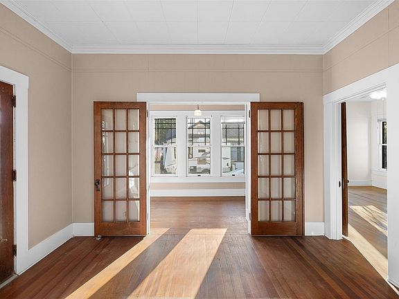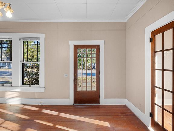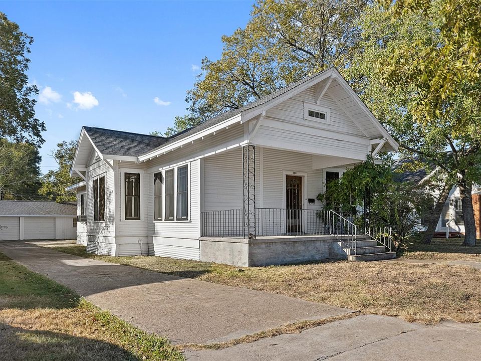 Charming 1923 home which has been in the same family since it was built. Enter the home from a pretty covered front porch and through a gorgeous bevelled glass front door. Lovely formal living room with hardwood floors, brick-surround fireplace, and beautiful French doors leading to dining room and sunroom. Spacious dining room features hardwood floors and built-in storage benches. Large kitchen with ample storage and featuring vintage/antique stove and open to family room/den area with access to the backyard. Two bedrooms each with hardwoods and closets, and a light and airy sunroom which could easily work as a third bedroom. Oversized two-car garage with attached workshop offers plenty of extra storage. A back alley provides additional access to the property. Additional features/updates: all appliances remain, roof installed 2020, shower pipes and valves replaced 2023, all windows and screens professionally washed 2025.