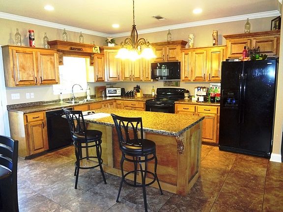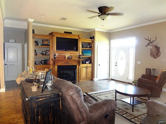 Four bedroom, two and a half bath brick home with 2 car covered parking, decked pool, several storage buildings and almost 5 acres! Some standout features are the open floor plan, kitchen with island and granite counters, views of the spacious land and pool from many rooms. The high ceilings and split floor plan for the bedrooms are a bonus. The tall windows allow for natural light in this comfortable central heat and central air home. The gas log fireplace rounds out the many features of this house on the hill. Room for animals and recreational vehicles.