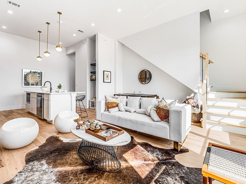 These architecturally striking four-story residences blend clean, contemporary lines with warm urban textures — think rich brickwork, sleek metal accents, and oversized windows that flood each space with natural light. Inside, the vibe is effortlessly chic: elegant hardwood floors, light modern slim shaker cabinetry, quartz countertops, and industrial-inspired lighting come together to create a refined yet edgy atmosphere.