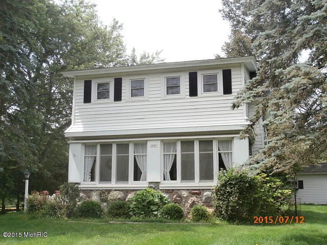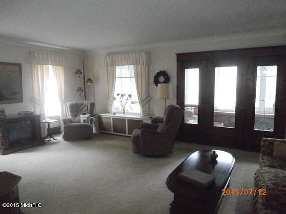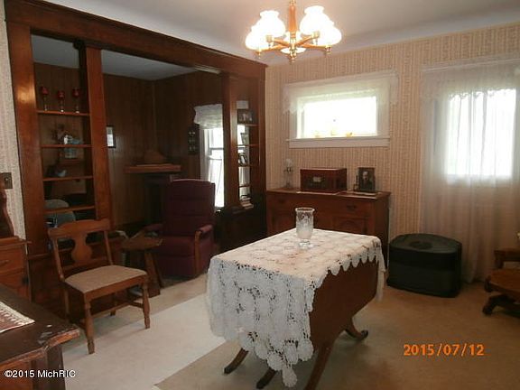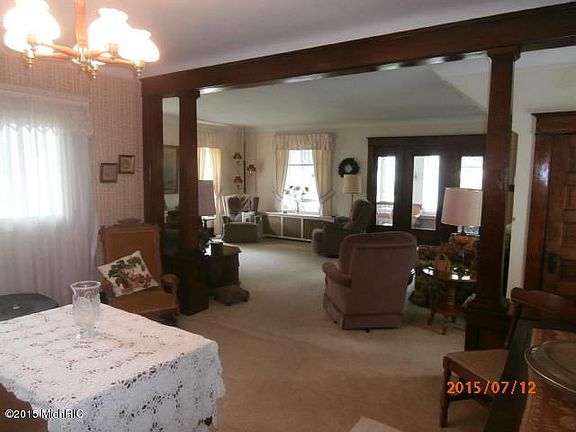 Rare Find! 5.48 acres just on the outside edge of the city limits! Well maintained home, featuring natural woodwork, two sets of colonnades separating dining area, den and large living room. Lots of natural sunlight in the living room because of the lead glass windows, front door and sidelights, very unique design. Exquisite hardwood floors throughout home. Large upstairs bedrooms, beautiful glass, natural wood pocket doors separate two of the bedrooms. Updated roof, vinyl siding, windows, circuit breakers and well. Three bedroom, 1.5 baths, main floor laundry. Detached 1.5 car garage. Many outbuildings including a hip roof barn. It a mini farm in town!