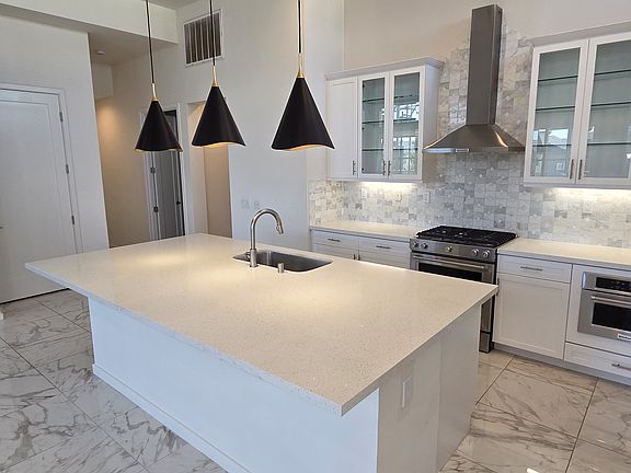 This penthouse showcases over $75,000 in high-end upgrades and an elegant design throughout. Step into the chef's dream white shaker kitchen, featuring upper-end stainless steel appliances, pull-out organizers, Euro soft-close drawers, marble backsplash, custom lighting, chandeliers, and pendant lights over a massive center island. A pantry and hall closet include outlets for convenient vacuum/Roomba charging.