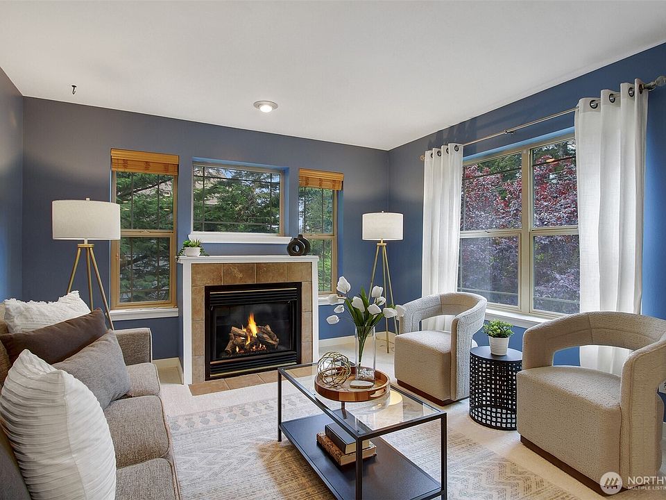 Gas fireplaceCorner unitNew stainless kitchen appliancesFlooded with natural lightPrimary bedroomWalk-in closetEn-suite bath
