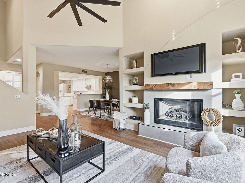 This community is perfectly positioned along the Tom Fazio-designed Raptor Course at Grayhawk Golf Club. For golf lovers, it's paradise! Two world-class 18-hole courses right outside your door, each offering strategic play and unforgettable rounds. Inside, the three-bedroom, two-and-a-half-bath layout showcases contemporary styling throughout, creating a refined desert retreat that feels elevated in style yet grounded in everyday comfort. Step inside and immediately feel the lift of soaring ceilings, rich wood-look flooring, and a warm fireplace that anchors the living space. This home is perfect for relaxed evenings or effortless hosting. The kitchen is a showpiece, featuring crisp white cabinetry, sleek quartz counters, stainless steel appliances, recessed lighting, a stylish tile backsplash, and a two-tier peninsula with breakfast bar seating for casual mornings or conversation-filled gatherings.