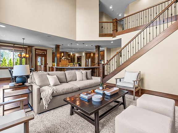 On a quiet cul-de-sac in The Bridges, this stunning home provides a private sanctuary within one of Bend's flourishing SE neighborhoods. Towering windows filter natural light into an open concept main living area with direct access to the fenced back yard, large covered back deck & paver patio with fire pit, perfect for outdoor dining & entertaining. The spacious kitchen is anchored by a large island with ample bar seating & accented with Dacor appliances, soft close cabinetry & walk-in pantry. On the upper level, a luxurious primary suite features a private covered balcony, 2-way gas fireplace & lush bathroom with jetted tub & walk-in shower. Also upstairs, a richly appointed office with a private balcony, additional bedroom & full bath plus a large bonus room. A main level ensuite bedroom & an expansive garage workshop provide additional floor plan flexibility, while the miles of community trails, fitness center, pool & proximity to Alpenglow Park make this an unbeatable location.