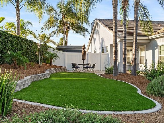 The kitchen includes a large center island and ample storage space, perfect for any culinary enthusiast. The front yard is designed for easy maintenance and low water usage with artificial turf. The backyard offers a relaxing retreat with a metal patio cover, natural grass, planters filled with lovely flowers, and trees. Additional storage is available on the side of the home with a sturdy shed.