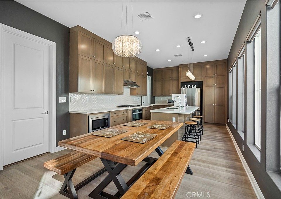 Welcome to the prestigious and fully secured Canyons at Porter Ranch, an exclusive gated community offering 24-hour security and showcasing sophisticated contemporary architecture. This exquisite single-family residence presents an impressive 2,266 square feet of thoughtfully designed living space, featuring four bedrooms, three bathrooms, and a versatile loft. The charming Yellowstone facade greets you with an inviting porch that leads to an elegant foyer, highlighted by a stunning, oversized chandelier. Step into the bright and expansive open-concept great room, seamlessly connected to the formal dining area and a beautifully appointed chef’s kitchen. The kitchen is equipped with luxurious quartz countertops, an expansive center island, floor-to-ceiling custom cabinetry, a walk-in pantry, premium stainless steel appliances, and a spacious breakfast bar—ideal for both daily living and stylish entertaining. Soaring high ceilings and modern recessed lighting enhance the airy atmosphere, while abundant natural light floods the living areas. For added convenience and privacy, automatic blinds are installed throughout. The serene and sunlit master suite serves as a private retreat, featuring large windows, a generous walk-in closet, and a lavish master bath complete with a dual-sink vanity, a sleek glass-enclosed shower, and a separate soaking tub. Upstairs, a conveniently located laundry room, two additional guest bedrooms, and a well-appointed hall bathroom provide comfort and functionality. A highly desirable first-floor bedroom with a full bathroom—perfect for guests or as a private home office—sits adjacent to the foyer. The spacious two-car garage offers direct access and includes custom cabinetry for ample storage. Provided solar panels also add ease to residents power bill. Residents enjoy access to exceptional resort-style amenities, including a sparkling heated pool and spa, a contemporary clubhouse, inviting BBQ areas, relaxing lounging spaces, and a vibrant splash pad. Nestled near top-rated schools, scenic trails, and major freeways, this remarkable home embodies the pinnacle of modern luxury living in one of Porter Ranch’s most sought-after neighborhoods.