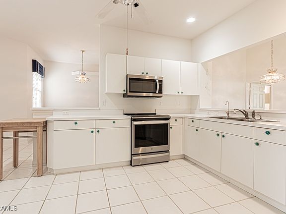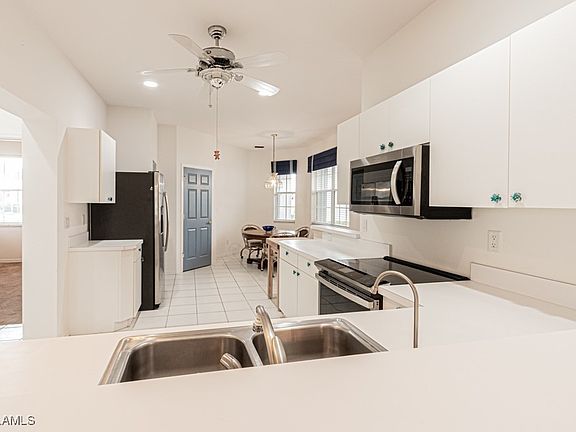 Wonderful opportunity to own this lovely villa that offers gorgeous views of the pay-as-you-play golf course and lake right from your own backyard. The roof was recently replaced in 2023, and the home is fully equipped with storm protection for peace of mind. The owner's suite features a spacious walk-in closet, a tub, and a walk-in shower. You'll love the easy access to the lanai from both the living area and the owner's suite - perfect for relaxing outdoors. The second bedroom is outfitted with a Murphy bed and a built-in desk, making it a great space for guests or a home office, with a full bath right next door for added convenience. The kitchen is spacious and offers plenty of storage, plus a cozy breakfast nook. You'll also enjoy the large 2-car garage, a convenient half-bath off the dining area, and a versatile open den that can be used however you see fit. You're just steps away from the Gordon G. Lewis golf course, where you can take advantage of the pay-as-you-play option. The low fees cover basic cable and internet, making this an incredible value. Plus, you'll be ideally located near I-75, beautiful beaches, shopping, and the airport. This villa offers everything you need for easy living - don't miss out on making it yours!