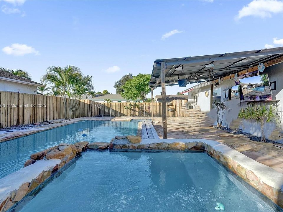 Northern Style 3/2 heated pool & spa home. NO HOA New 2025 Rheem 3-Ton A/C. 4Pt Inspection Passed. Located in a great neighborhood on a spacious corner lot, circular driveway. Fully updated kitchen, custom 42” high Shaker Cherry cabinets, lots of storage, matching granite countertops & unique split-level sink & tile flows through the kitchen & main area. Converted garage has separate entrance w/ a/c currently used as storage/office, maybe a rental space, easily converted back. Crafted Pecky Cypress wood ceiling beams & walls in living area & primary bedroom give it a warm homey feel. Cabana bathroom leads out to a Waterfall Spa that flows into the oversized Pool that can be heated independently, Designed Sandstone deck, with covered patio, fully fenced in backyard, perfect for entertaining