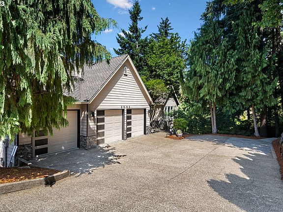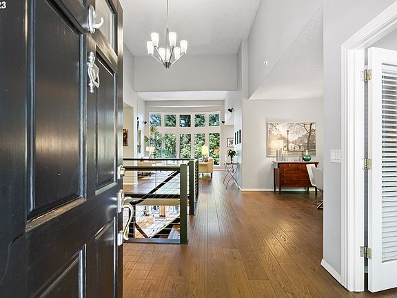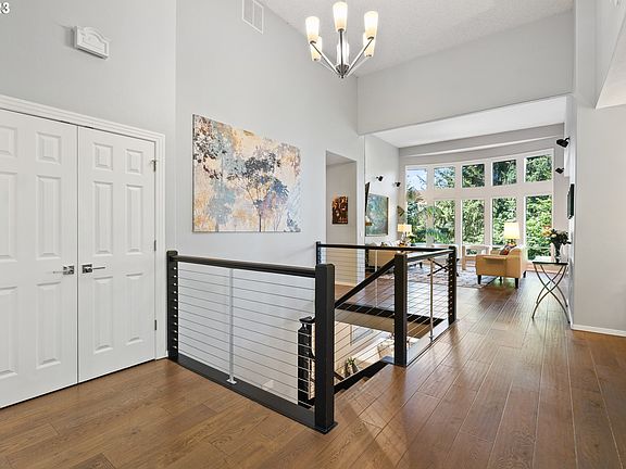 Stunning, secluded, treehouse offers main-level living ease - tucked into the beautiful West Linn Hills. This home has been beautifully updated and well-maintained with great attention to detail. The chef's kitchen was remodeled in 2018 to include: quartz counter tops, glass backsplash, KitchenAid Chef's line with 6 burner gas stove top, double convection ovens, French door refrigerator, dishwasher, and bosch vent system. With soaring ceilings as you enter, you are greeted with a wall of windows offering a tranquil, tree view in the summer and stunning seasonal valley views in the fall and winter complete with custom, electric blinds and Bose surround sound. Wide plank hardwood floors cover the main level with a custom wood and stainless steel stair railing. The stacked stone fireplace wall houses a gas fireplace for cozy autumn/winter nights. The main level primary bedroom and bathroom were recently remodeled in 2020 with floating vanity, soaker tub, Hansgrohe fixtures, jetted shower with rain-head, and custom tile work. The main level office has a wall of windows and double French doors. Completely remodeled laundry room including LVT floors, and newer washer and dryer. Three well-maintained decks offer indoor-outdoor living ease. High-end lighting fixtures bring contemporary appeal to the home. The lower level features a wide plank laminate, two additional primary suites, a large 4th bedroom, and a family room with direct access to a large entertaining deck. Home backs to a greenspace and lives like a private oasis.