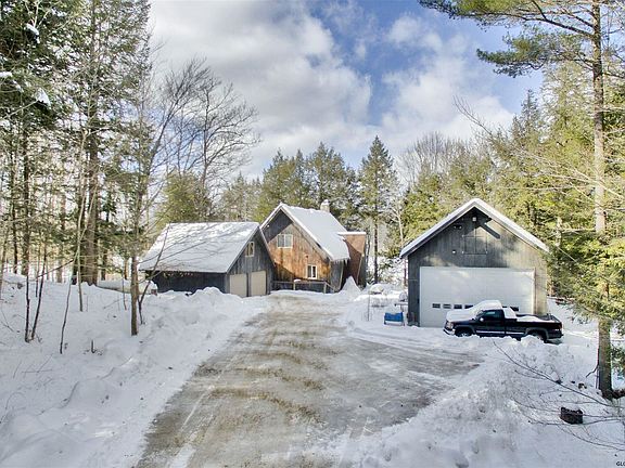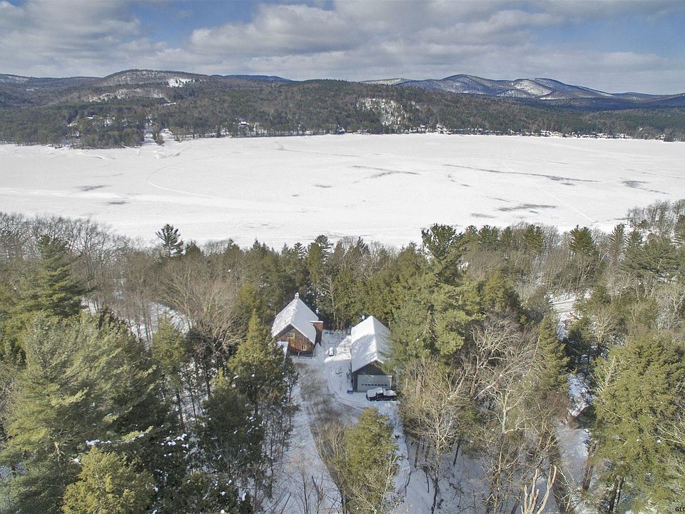 Immaculate and well maintained lakefront Adirondack Chalet boasts 100' HRBR lake permit with an amazing sandy beach located in a quiet cove. This property includes a large (approx. 1000 SF) detached garage w/overhead doors, winch, full electric service throughout, separate insulated work shop & 2nd floor. Fully fenced in yard w/ electric remote operated gates. A wall of windows facing the lake offers beautiful lake and mountain views. Plenty of room for friends and family to visit...spacious first floor bedroom, second floor master suite with walk-in closet, full bath & loft, third bedroom in the lower level for the kids! Mud/ laundry room located off the breezeway leading to the attached 2 car garage w/second floor storage. A unique setting to enjoy year round!