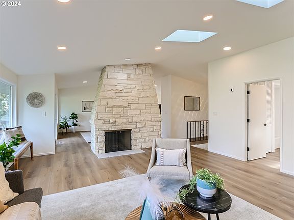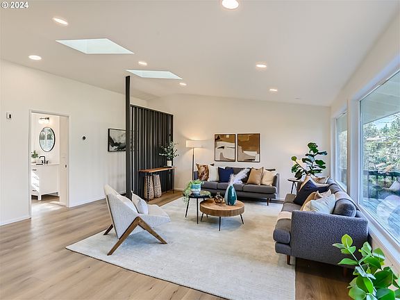 Custom built in 1971, this iconic mid-century gem has been completely remodeled with a timeless appeal. By incorporating low maintenance materials throughout, it frees up time to enjoy your life! Clean and simple : skylights and vaulted ceilings for an abundance of natural light, walls of glass to watch the birds, the ever changing clouds and serene green surroundings, ample interior lighting so there is never a grey day.Stone and laminate composite flooring throughout is bullet- proof. Bright, open kitchen and luxury baths. Primary bedroom has vaulted ceilings and a walk in closet complete with organizers. Beautiful skylit master bath with heated floors, oversized shower, backlit mirror and porcelain tile, outlet for heated toilet seat. New deck and walkways. Additional features include: 2 en-suite baths on the main level, washer/dryer hookups on the main and lower level, three full baths, room for home theatre/ home gym /swing space on the lower level in addition to 2 bedrooms. Three car parking on the main level as well as a full 2 car garage below. Large, private lot .41 acre , gardening space. Quiet street. Two neighborhood parks /swimming pools within minutes of the home. Incredibly convenient location close to neighborhood shopping, restaurants, I-205, I-5 and PDX. ** See attached feature sheet