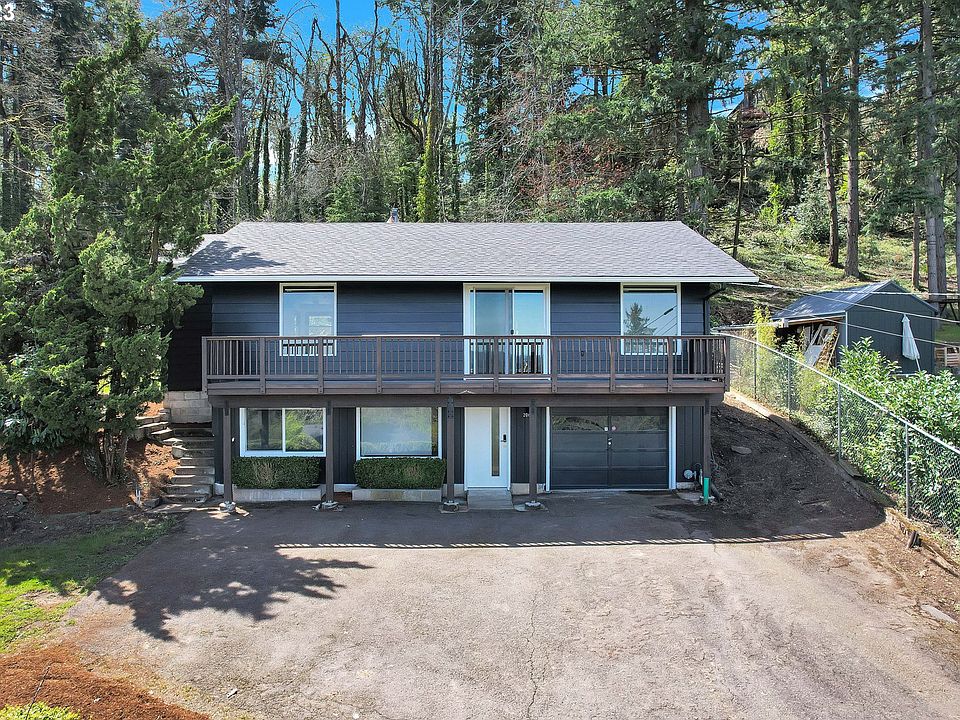 Beautiful piece of property situated on almost an acre of land with a large driveway, postcard views, and meticulous features. The main floor consists of a spacious entry with a full bed and bath. You'll find the extremely open living room, upgraded chef's kitchen with stainless steel appliances and island, and two more bedrooms on the upper floor. Enjoy relaxing on the deck overlooking the gorgeous view. Greatly landscaped backyard has a patio space for bbq'ing and entertainment and an outbuilding for bonus storage space.