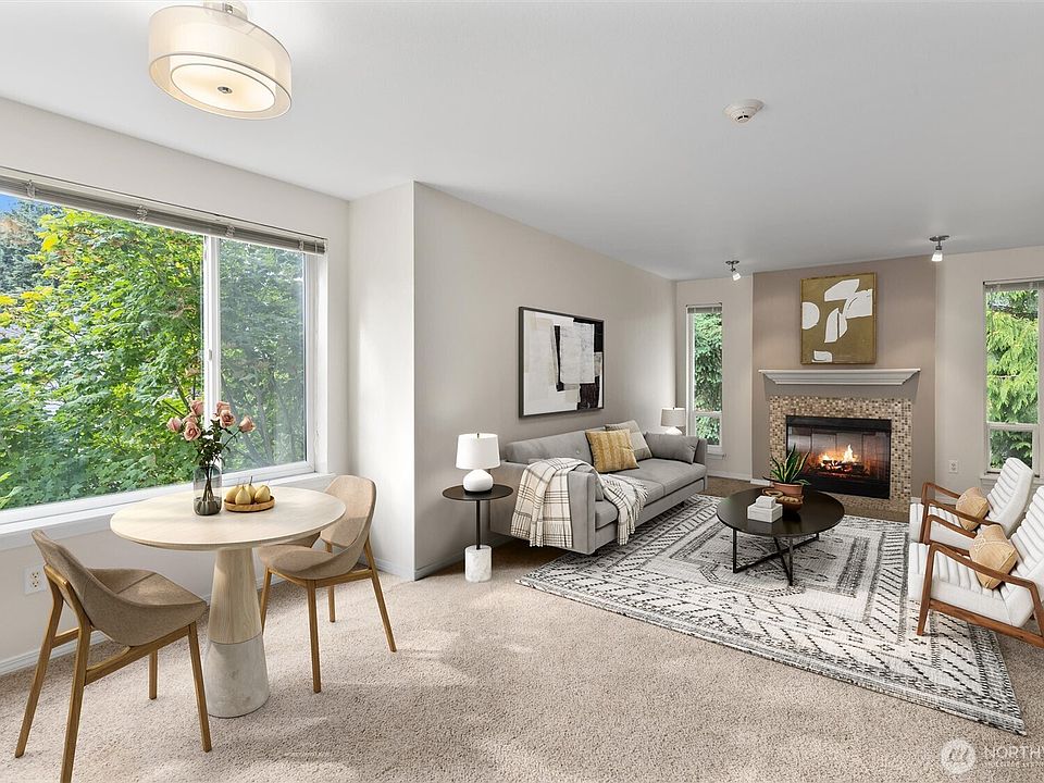 Beautifully refreshed top-floor end unit with bright, open spaces and modern updates. Ideally located near Edmonds College, shopping, and dining- this 2 bed/2 bath condo has a remodeled kitchen with extra island storage, a new refrigerator, and brand new carpet. Both bathrooms feature upgraded cabinets, counters and flooring and the laundry area includes a new washer/dryer with additional added storage. Relax in the living room with your fireplace or step onto the deck for a BBQ with treetop views and enjoy the breeze. This unit also has exterior patio storage, 2 parking spaces and includes a portable AC unit.