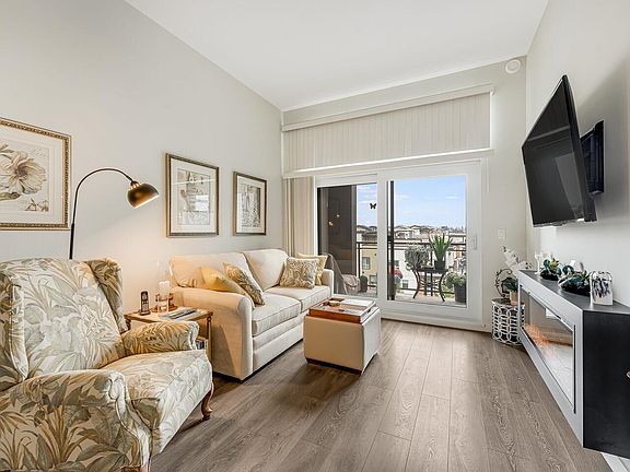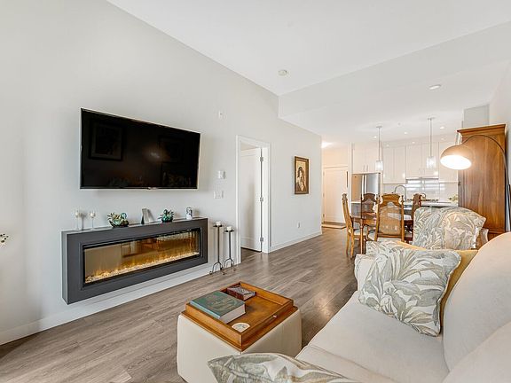 This meticulous 1 bed, 1 bath top-floor unit comes boasts attractive neutral décor with attractive laminate floors, gorgeous kitchen w/SS appliances, quartz counters and breakfast bar, cozy living room electric fireplace, 10’5 ceiling & patio door to balcony with attractive mountain view. With 662 sf this spacious 1 bdrm unit features a large laundry room with bonus storage and a deluxe 5-piece bath with twin sinks and a unique primary bedroom w/mtn view & walk through closet. This unit is located in the quiet side of the building facing out to the abundant visitor parking and yet it is conveniently located within an easy walk to the Willoughby Town Centre, with many shops, restaurants, and groceries just steps from home. This home is an absolute must see for the discerning Buyer lookin