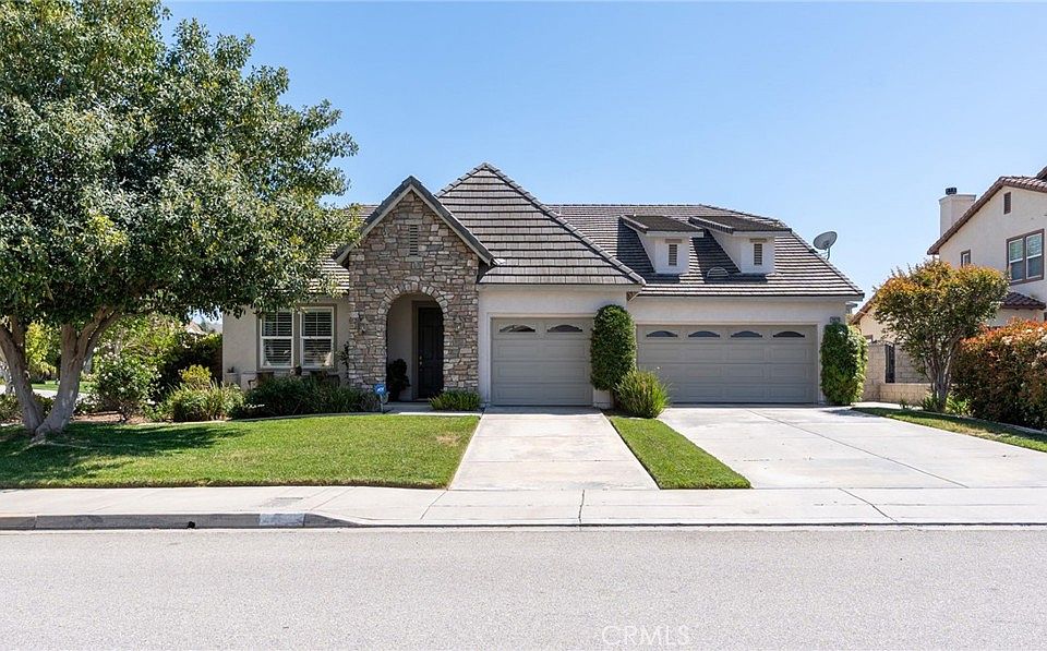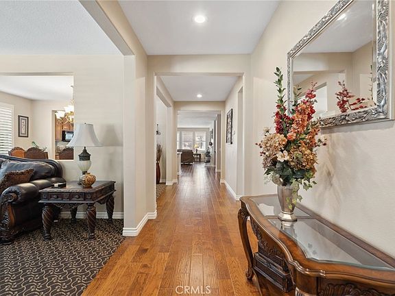 Welcome to gracious living! This rare and sought after floor plan features 3 spacious bedrooms and 2 bathrooms on the ground floor which lives like a single story. Plus a loft/ bonus area with a oversized bedroom suite and a full bathroom upstairs. Totaling 4 bedroom and 3 1/2 bathrooms in approximately 3,380 square feet. This home offer the residents numerous lifestyle options including multi-generational living. The interior boasts beautiful rich hardwood flooring throughout except bedrooms. Preferred flat volume ceilings on the first floor with 8 foot doors. The chefs kitchen features abundant maple cabinets with under cabinet lighting. Upgraded appliances include double oven and a 5 burner cooktop with microwave oven and quiet wash dishwasher. Premium granite countertops with pendent lighting shine on a oversized kitchen Island and a 4 chair breakfast bar. The family will enjoy the great room concept with a cozy/ gas fireplace. Decorative plantation shutters throughout except sliding door. The private and spacious master suite offers dual walk-in closets and a spacious bathroom with oversized soaking tub and shower. This outstanding European Cottage exterior is set on a spacious corner homesite of approximately 11,325 square feet which offers residents the feeling of open space and brings the outdoors inside your home. The beautiful ledger stone pool and spa is the focal point to enjoy our beautiful Southern California climate. Enjoy family time relaxing under your Alumawood patio cover with ceiling fan or enjoy some fresh fruit from your orange or lemon tree. The built in barbecue with bar seating is adjacent to the covered seating area. There is also a incredible partial view of the majestic San Bernardino National Forrest. Energy saving features include LED ceiling lights throughout and a EV charger port in your 3 bay garage. The wonderful community of Orangecrest offers highly rated schools, a community center with a library and acres of parks makes for a relaxing evening walk. Nearby shopping and restaurants adds to the convenience of Orangecrest living!