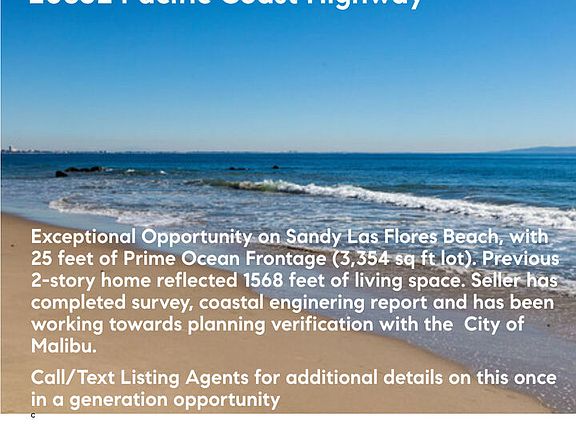 Build your dream coastal retreat on the sands of Las Flores Beach, one of Malibu's most coveted communities offering rare close-in access to Santa Monica and the Westside. First time on the market in 50 years, this property features 25 feet of ocean frontage with approximately 135 feet of depth (3,354 SF lot area). Public records reflect a 1,568 SF prior residence with emergency entitlement potential up to 1,725 SF allowing for a streamlined rebuild process without Coastal Commission review. The seller has already completed Phase 1 and Phase 2 lot clearance, a 2025 property survey meeting all City of Malibu planning requirements, and a 2025 coastal geotechnical/wave uprush study with initial submissions to the City of Malibu Re-Build Planning Department to obtain rebuild potential specifics. This invaluable head start provides a rare opportunity to design and build your own beachfront haven on the sand in one of Malibu's most coveted and convenient coastal communities. 20832 Pacific Coast Highway - a truly remarkable offering.
