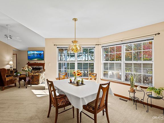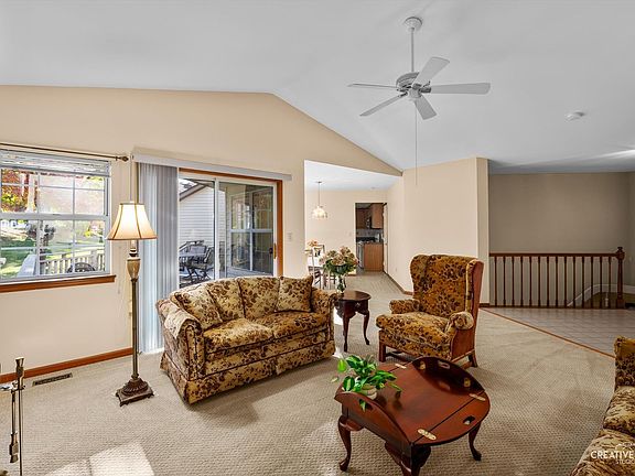 Nestled in Carillon - the sought-after 55+ community - this Marquette Model is a rare find and a true must-see. Step into a welcoming foyer with a generous coat closet, then discover a bright second bedroom bathed in natural light. The living room impresses with vaulted ceilings, a cozy gas fireplace, and a sliding door that opens to an expansive deck - perfect for morning coffee or evening gatherings. The adjacent dining area features large windows overlooking a peaceful, tree-lined backyard. The kitchen comfortably accommodates a small table and includes a brand-new stainless-steel refrigerator as well as convenient garage access. On the other side of the home you'll find a full guest bath and well placed main-floor laundry closet. Retreat to the tranquil primary suite, complete with vaulted ceilings, oversized windows, a massive walk-in closet, and a private bath with a large shower - the ideal spot to relax and recharge. Downstairs, the full basement is an entertainer's dream: a roomy entertainment area with a built-in bar, abundant seating space, and plenty of storage. A motorized chair lift makes basement access easy, and the original laundry area remains downstairs if you prefer to wash there. Recent updates (within the last two years) include a new roof (this summer), new furnace, new sump pump, new carpet, new refrigerator, new washer and dryer and new toilets. The whole house was freshly painted in 2022. Comfortable, thoughtfully upgraded, and move-in ready - this home in Carillon is the perfect place to enjoy your next chapter. Schedule your visit today!