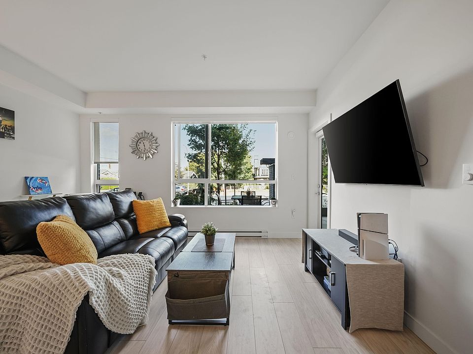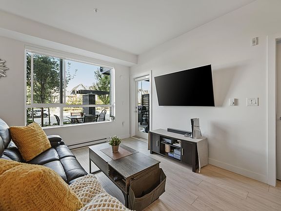 Welcome to Alexander Square in the heart of Willoughby! This bright ground-floor 1 bed + den, 1 bath home features a modern open layout with quartz countertops, sleek cabinetry, stainless steel appliances, and a breakfast bar. The spacious bedroom includes a walk-in closet, while the versatile den works as an office, guest room, or gym. Enjoy the oversized private patio with direct street access—ideal for entertaining, BBQs, or pet owners, plus the convenience of no elevator waits. Residents have access to incredible amenities including a rooftop deck with BBQs, fitness centre, stylish lounge, courtyard with cozy fire pits, and a dog park. Just steps to Willoughby Town Centre shops, dining, and services, with schools, transit, and Hwy 1 minutes away.